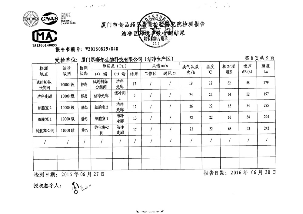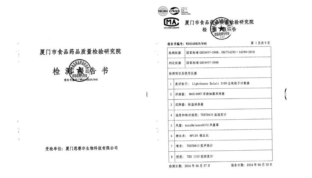 厦门恩赛尔生物科技有限公司位于国家级企业孵化基地海沧生物医药产业园,参照GMP标准建设有完善的研发生产实验室并通过厦门市食品药品质量检查研究院依据国家标准GB50457-2008的洁净级别检测。